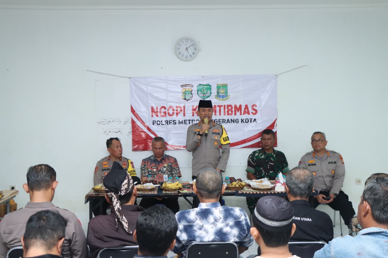 TANGERANG –zonanasional.id Kapolres Metro Tangerang Kota Kombes Pol Dr. Raden Muhammad Jauhari, S.H., S.I.K., M.Si. bersama Pejabat Utama Polres melaksanakan kegiatan Ngopi Kamtibmas bersama warga Kelurahan Larangan Utara, Kecamatan Larangan, Kota Tangerang, Kamis (30/10/2025) sore.
