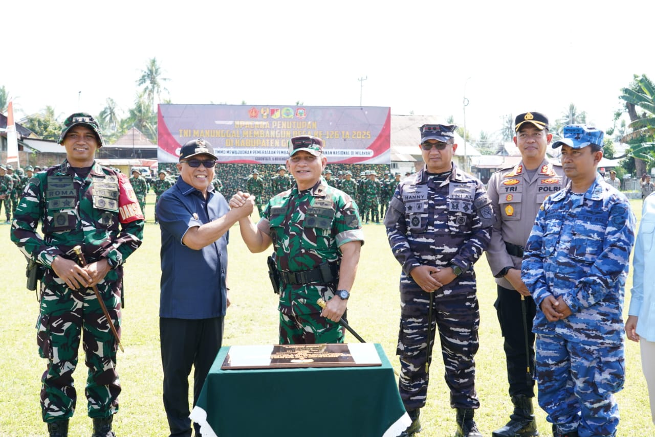 GORONTALO zonanasional.id – Komandan Korem (Danrem) 133/NW, Brigjen TNI Hardo Sihotang, memimpin upacara penutupan program TNI Manunggal Membangun Desa (TMMD) ke-126 tahun 2025 yang diselenggarakan oleh Kodim 1315/Kabupaten Gorontalo. Upacara ini berlangsung khidmat di di Lapangan Desa Tuladenggi, Kecamatan Telaga Biru, Kabupaten Gorontalo, menandai berakhirnya kegiatan yang telah berjalan selama satu bulan penuh. Kamis (6/11/2025).