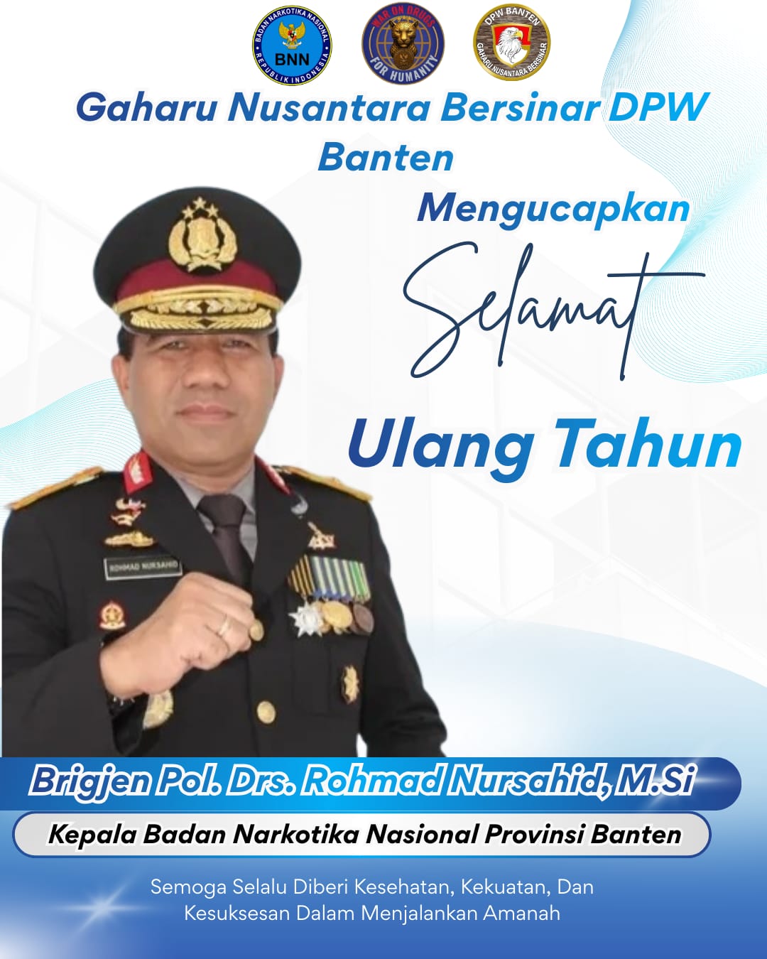Keluarga Besar Gaharu Nusantara Bersinar Banten menyampaikan doa dan harapan terbaik: “Semoga Bapak Brigjen Pol. Drs. Rohmad Nursahid, M.Si senantiasa diberikan kesehatan, kebahagiaan, kekuatan, serta keberkahan dalam setiap langkah pengabdian kepada bangsa dan negara, khususnya dalam upaya mewujudkan Indonesia Bersinar (Bersih Narkoba).”