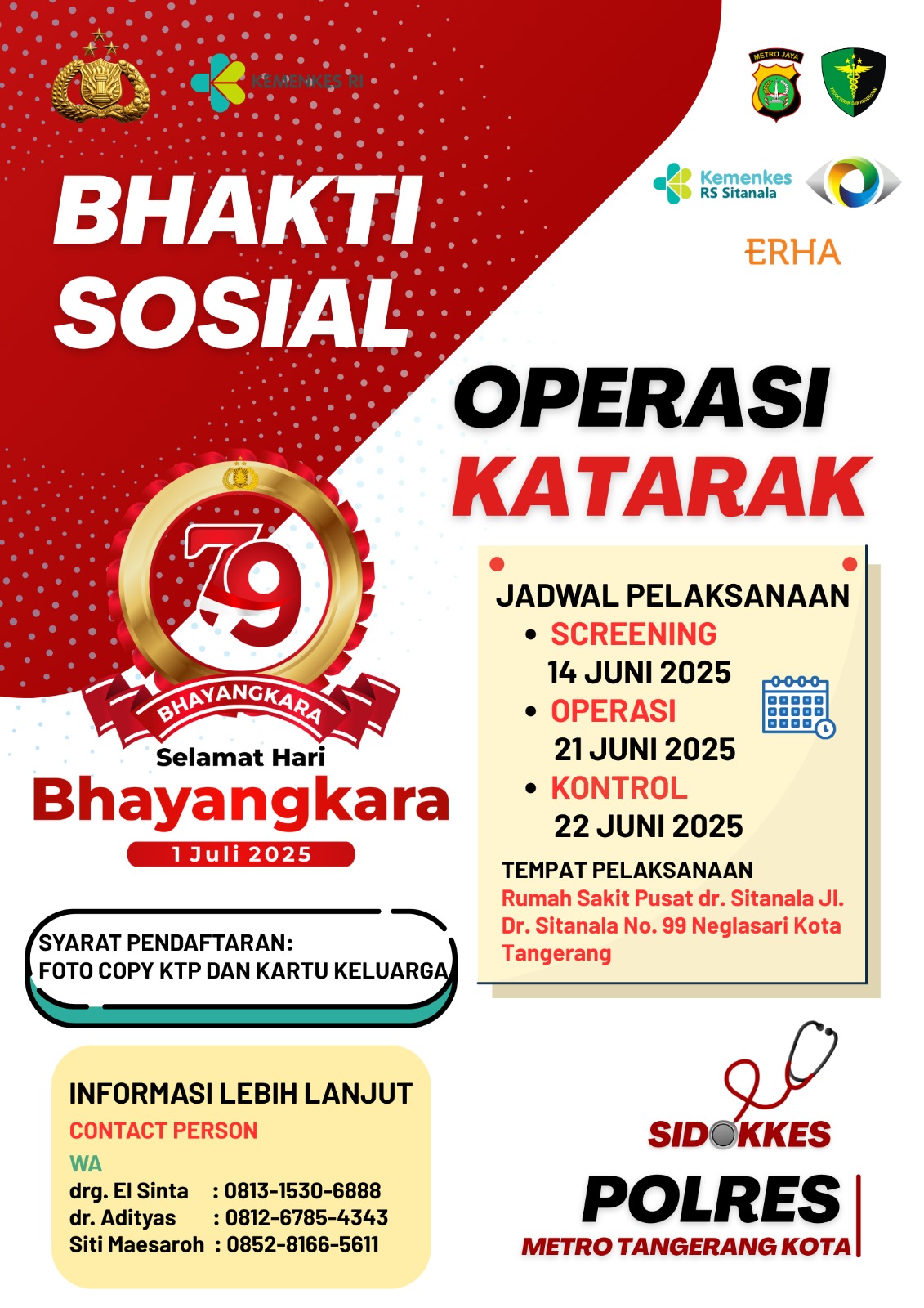 Tangerang, zonanasional.id – Kabar baik, dalam rangkaian peringatan Hari Bhayangkara ke-79, Polres Metro Tangerang Kota, Polda Metro Jaya pada tanggal 21 Juni 2025 mendatang akan melaksanakan kegiatan bhakti kesehatan berupa operasi katarak secara gratis untuk masyarakat yang kurang mampu.