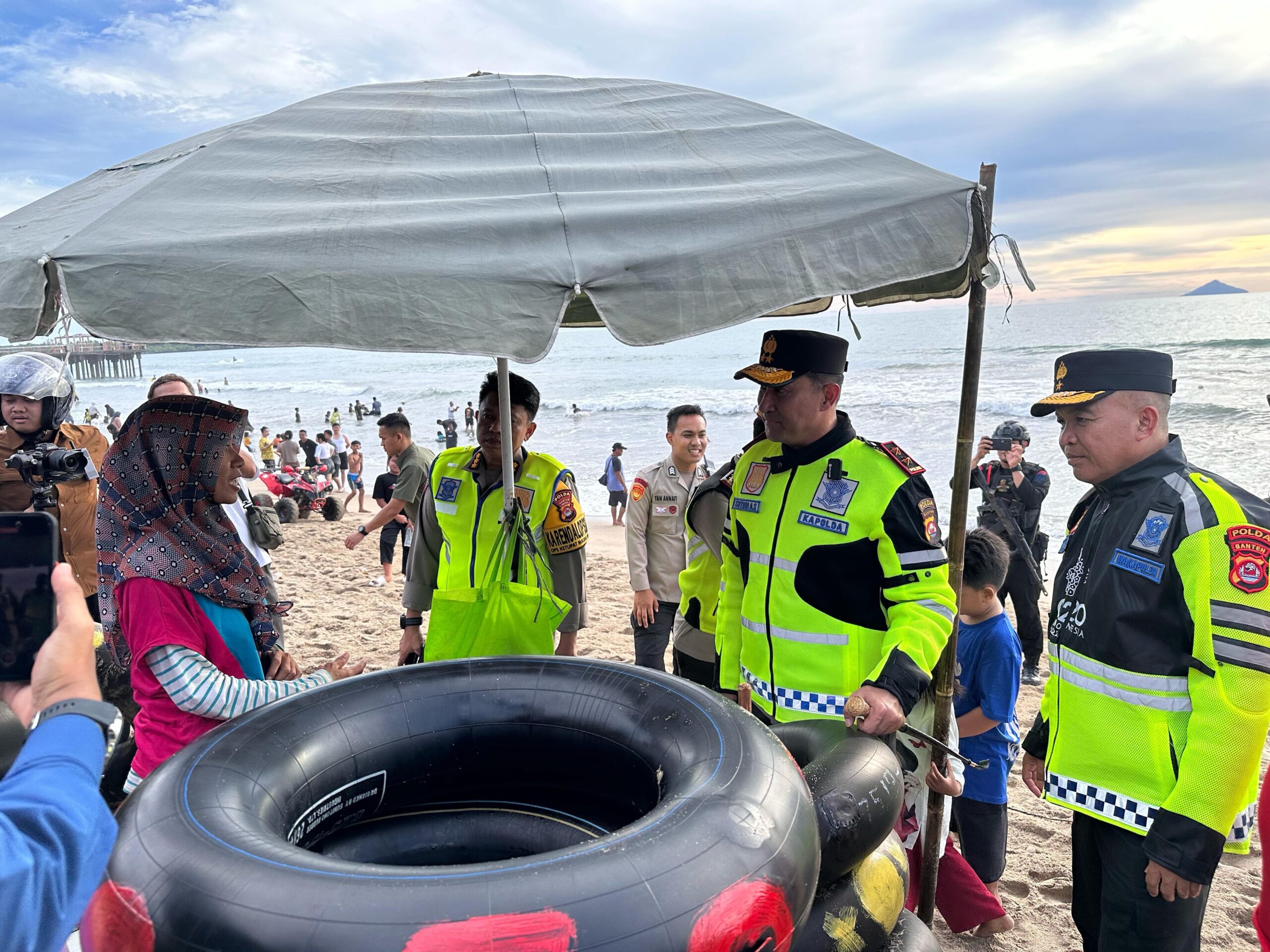 Dalam hal ini Kapolda Banten, mengingatkan kepada pengunjung yang masih berada di laut, terutama yang sedang berenang, untuk selalu menjaga keselamatan dengan menggunakan pelampung atau ban. “Saya mengingatkan kepada bapak ibu semua yang masih beraktivitas di pantai, terutama yang masih berenang, agar tetap menjaga keamanan dan keselamatan. Gunakan pelampung atau ban, dan jangan terlalu jauh ke tengah laut. Perhatikan ombak karena ombak bisa berubah kapan saja,” ingat Kapolda Banten.