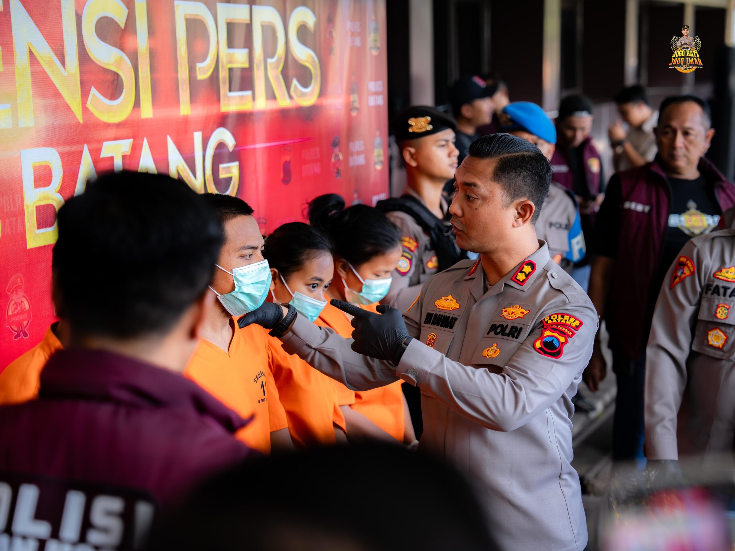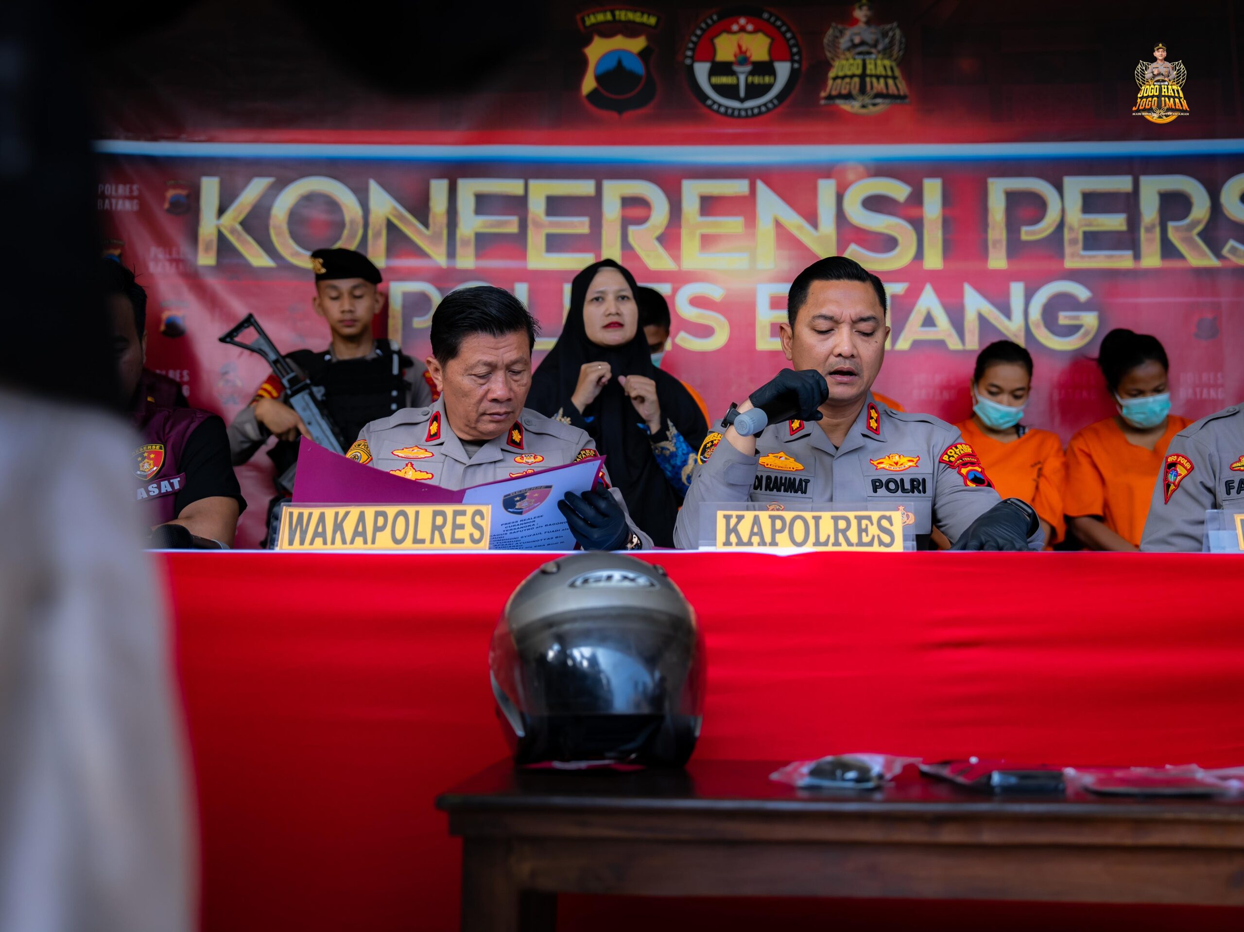 Kapolres Batang AKBP Edi Rahmat Mulyana, S.I.K., M.H. dalam konferensi pers mengungkap kasus pencurian dan pemberatan yang terjadi di dua lokasi berbeda di Kabupaten Batang. (Foto: Bidhumas Polres Batang)