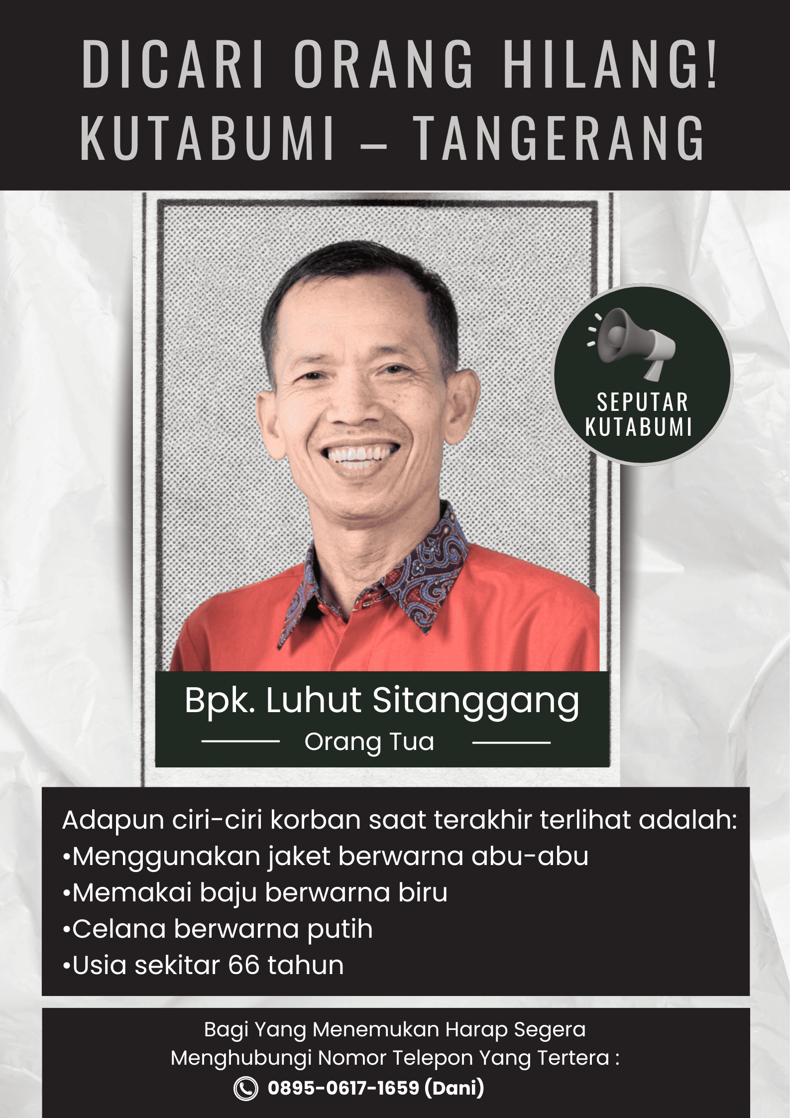 “Kami sangat berharap bantuan dari masyarakat. Jika ada yang melihat atau mengetahui keberadaan bapak kami, mohon segera menghubungi kami,” ujar pihak keluarga.