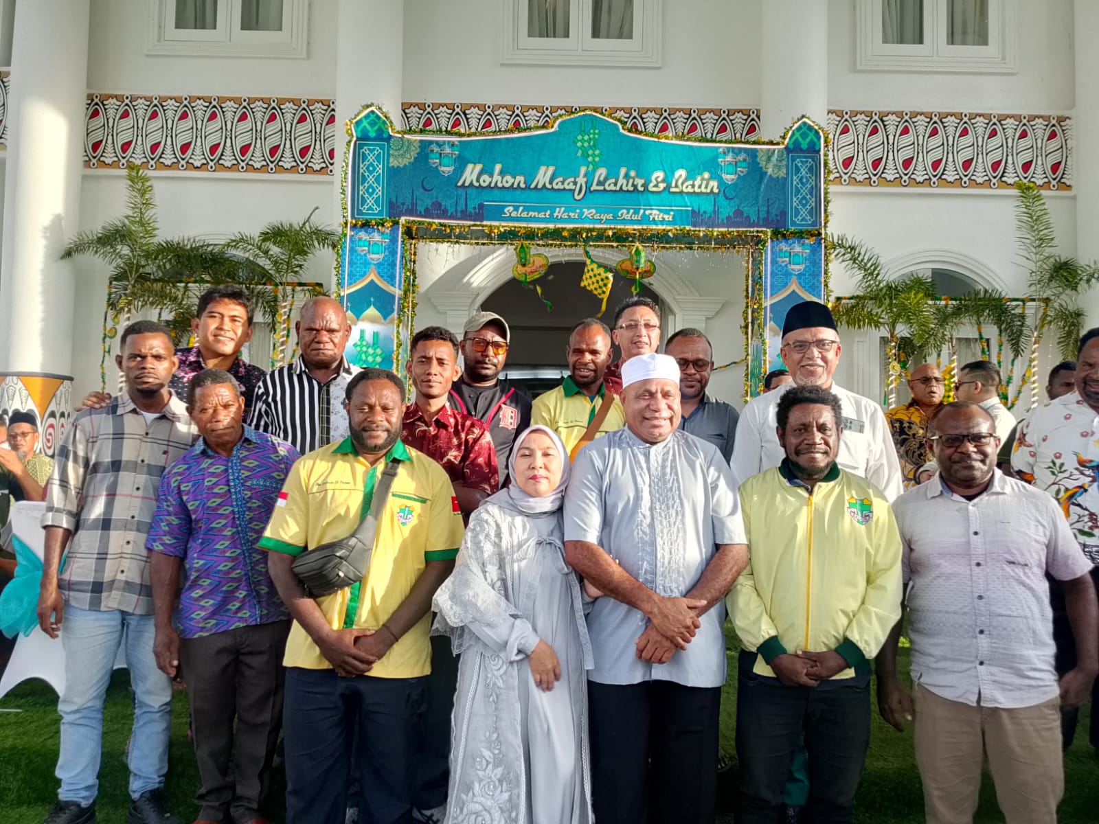 JAYAPURA- Perayaan Idul Fitri 1447 Hijriah menjadi momentum bagi Pengurus Pemuda Katolik Komisariat Daerah (Komda) Provinsi Papua periode 2025-2028, untuk membangun silahturahmi lebaran dengan Gubernur Papua, Komjen Pol (Purn) Matius Derek Fakiri di Gedung Negara, Kota Jayapura, Papua, Sabtu (21/3/2026).