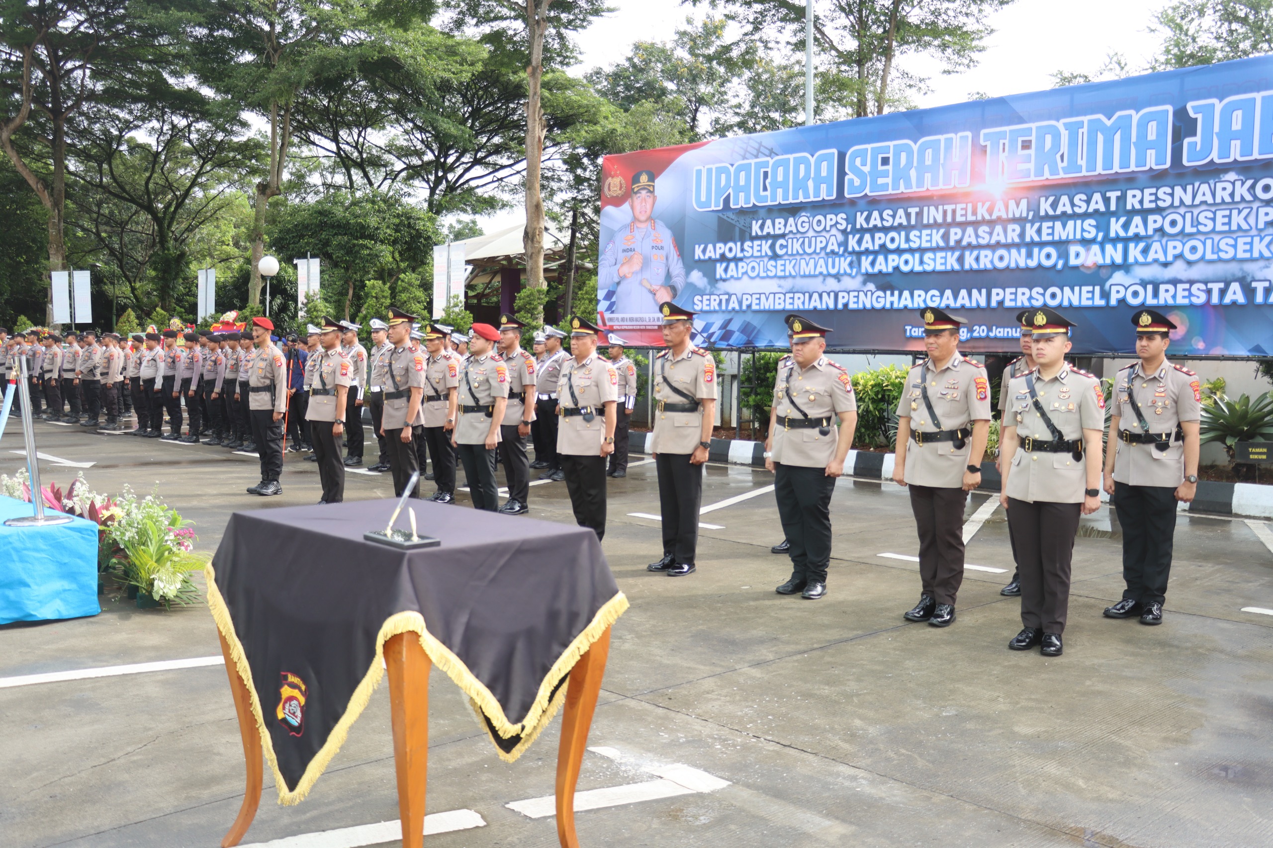 Polresta Tangerang menggelar Upacara Serah Terima Jabatan (Sertijab) sejumlah pejabat utama, Selasa (20/1/2026) di Lapangan Apel, Polresta Tangerang.