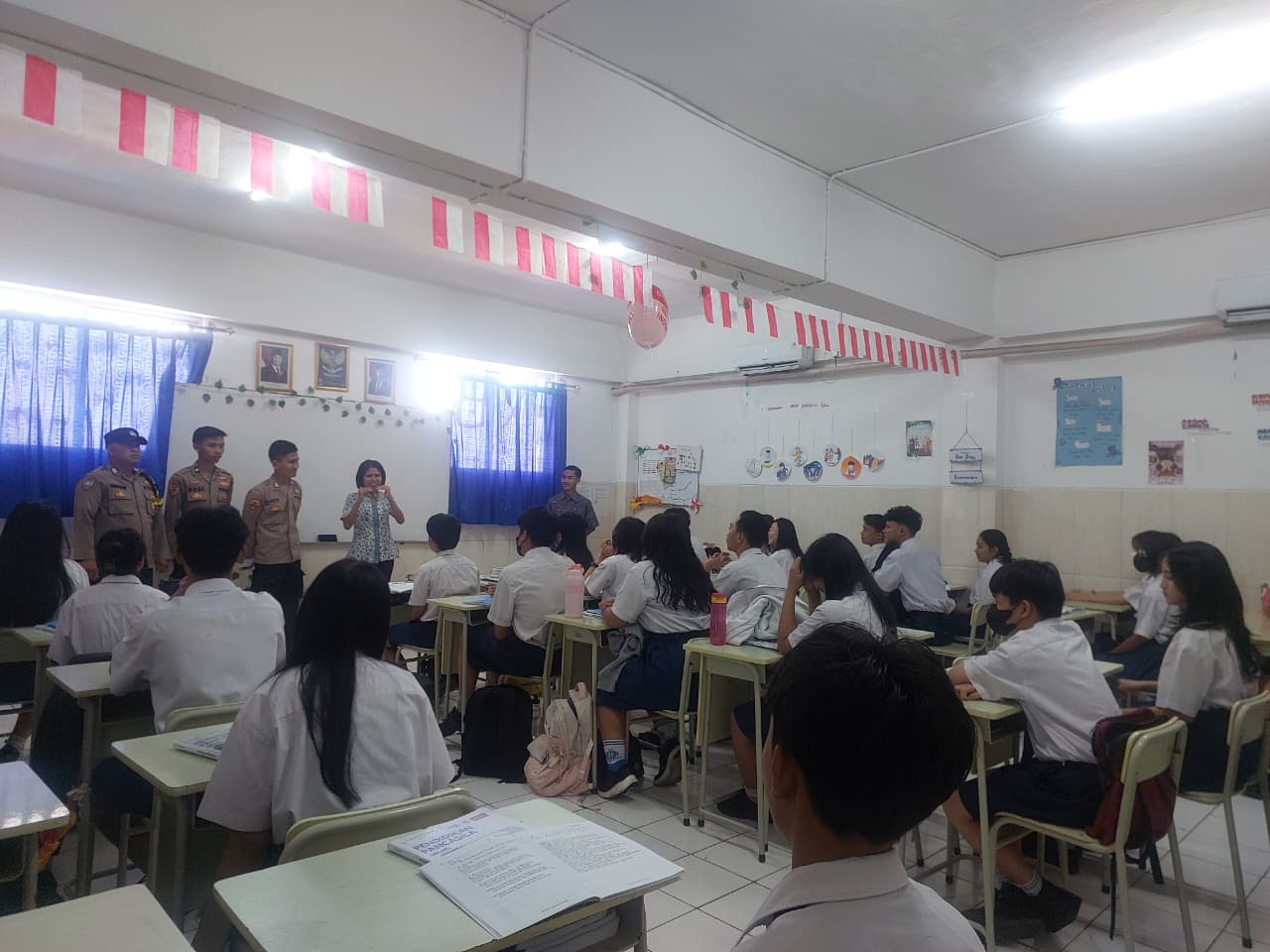 Hadir dalam kegiatan tersebut Bripka Didi dan Bripda Robi dari Bag SDM Polresta Tangerang, serta Bripka Hendrasari selaku Bhabinkamtibmas. Sementara dari pihak sekolah turut hadir Kepala SMP Mutiara Bangsa 6, Ibu Maria Asumta Nogo Amuntoda, S.Pd., bersama para guru dan staf sekolah.