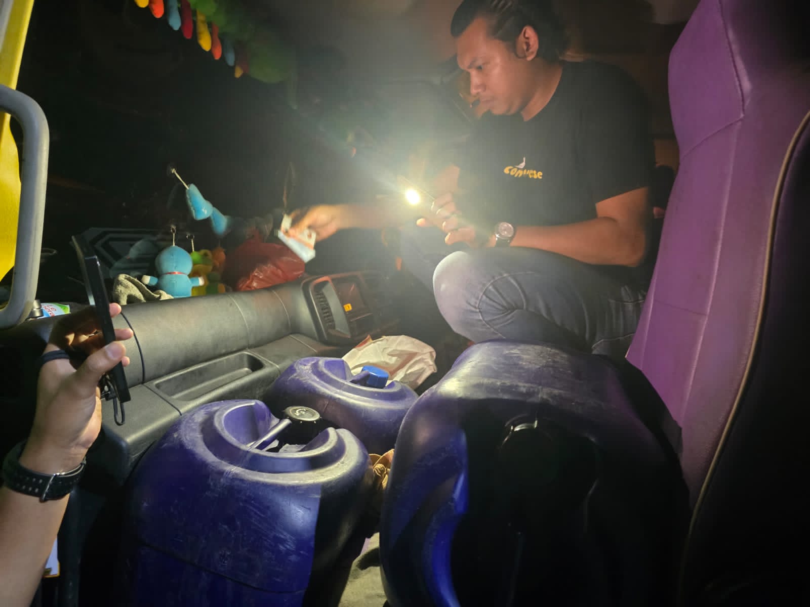 2).3 (tiga) jerigen berukuran 35 liter dalam keadaan terisi penuh di bawah dump mobil tepatnya di ram mobil yang diikat menggunakan tambang;